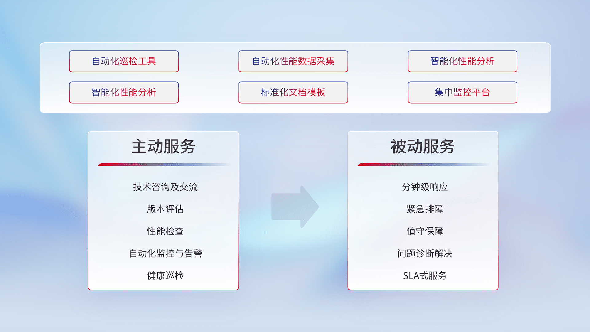 智能化工具和标准化文档,,,,保障服务质量,,提供主动服务(包含技术咨询、、、、版本评估、、性能检查、、、自动化监控与告警、、健康巡检)和被动服务包含(分钟级响应、、、紧急排障、、、、值守保障、、问题诊断解决、、、、SLA服务)。。