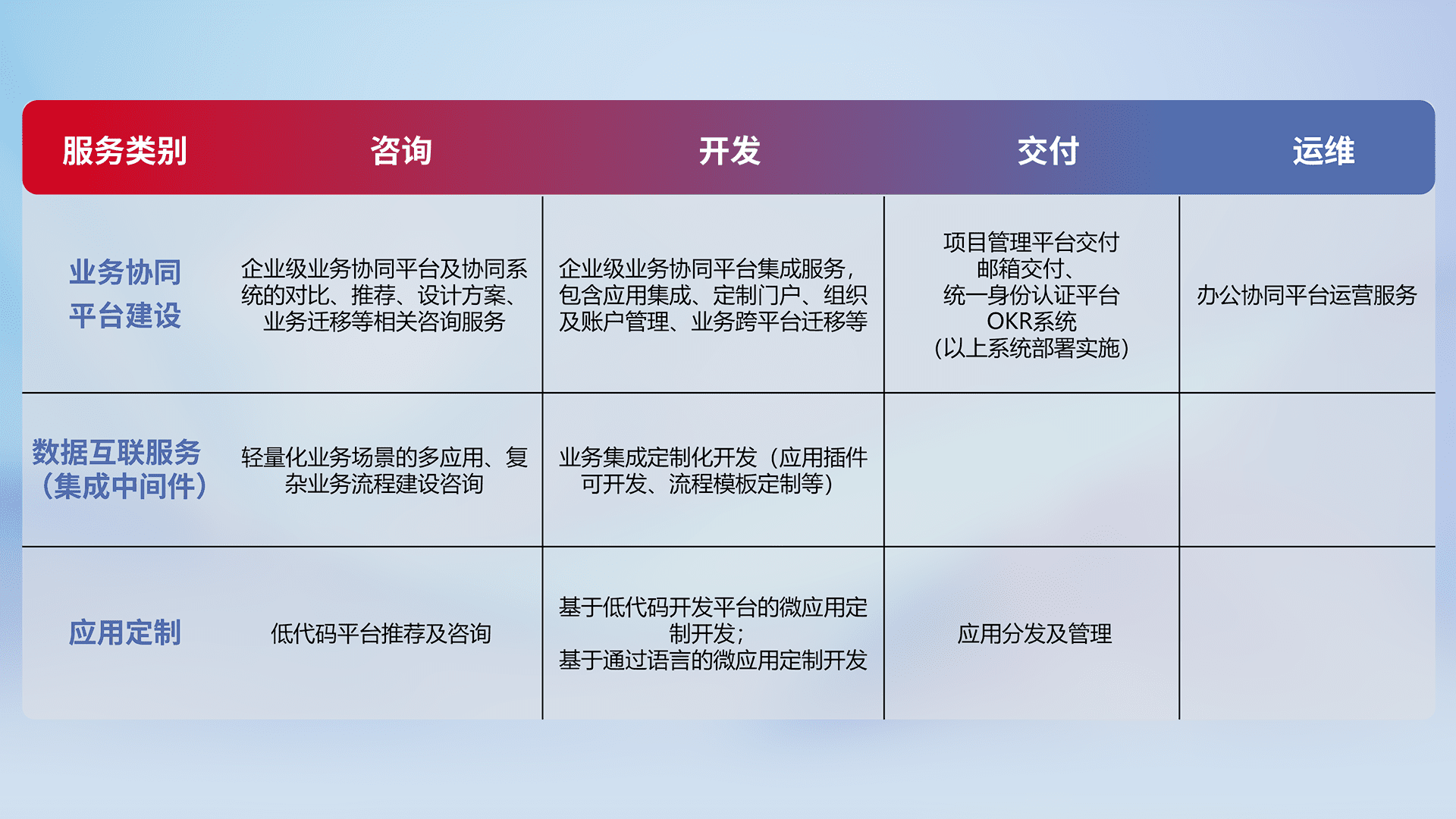 针对钉钉、、、、企微、、、IDaas等平台级产品提供产品的规划、、、方案、、、交付、、定制化开发等服务,,,,实现如统一协同办公、、、智能客户服务、、、、混合会议管理、、、智能数据查询、、、、等业务场景,,,,实现数字化转型。。